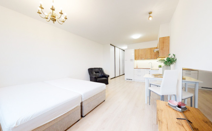 Pozostáva zo vstupnej chodby so vstavanou skriňou, obývačky prepojenej s kuchyňou a kúpeľne so sprchovým kútom a WC.