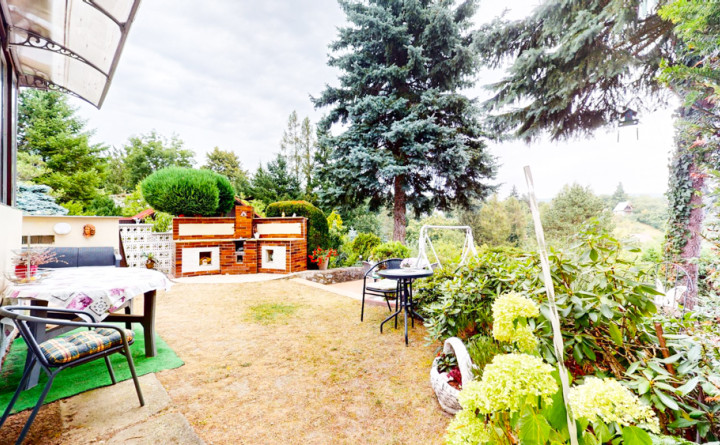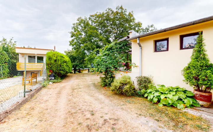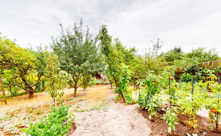 Záhrada o dĺžke cca 80 m a šírke cca 14 m je upravená s množstvom ovocných stromov ako aj okrasných drevín.