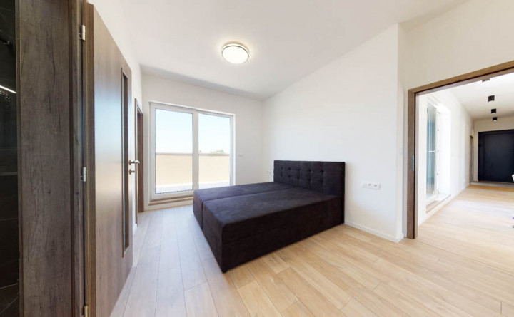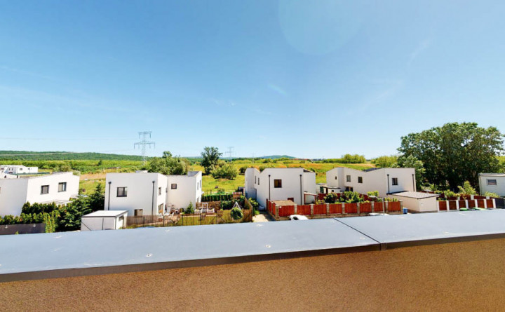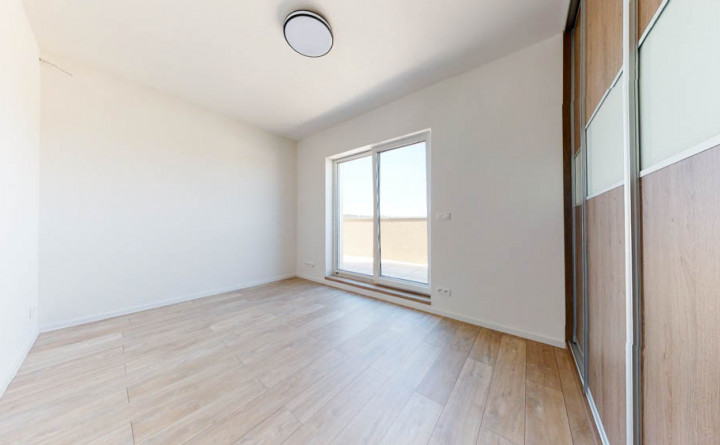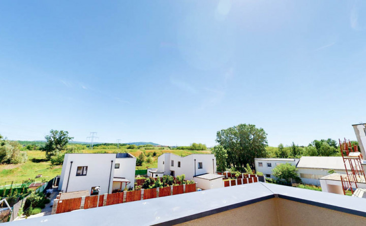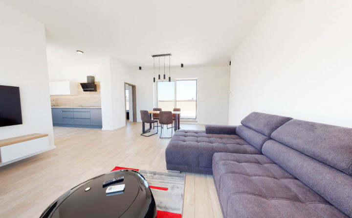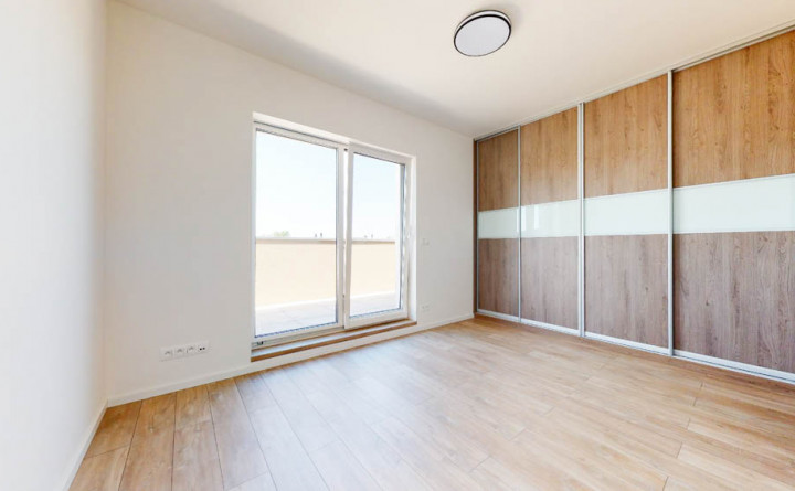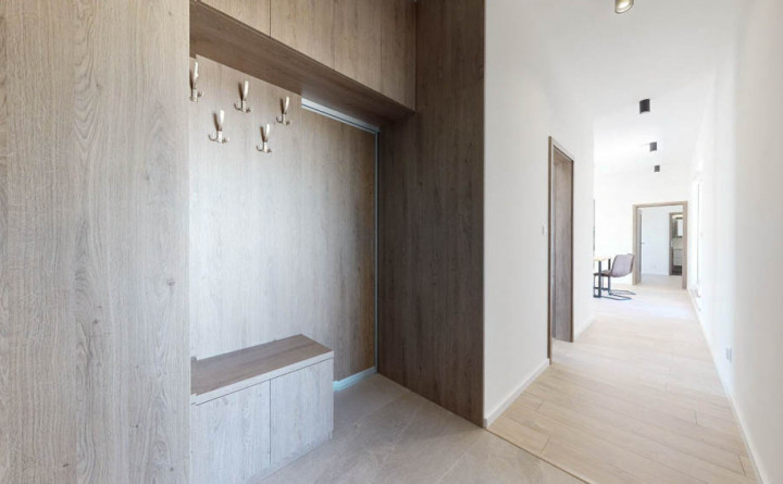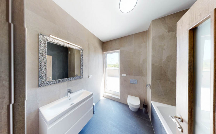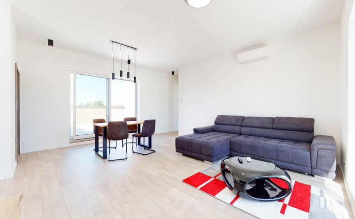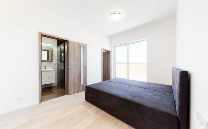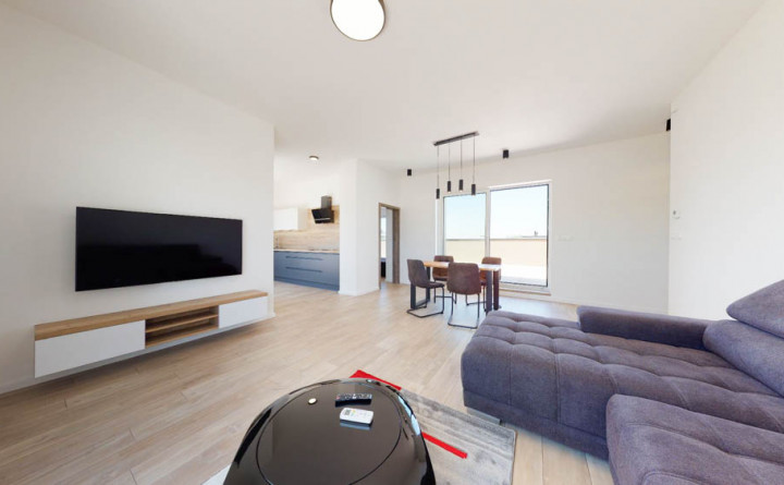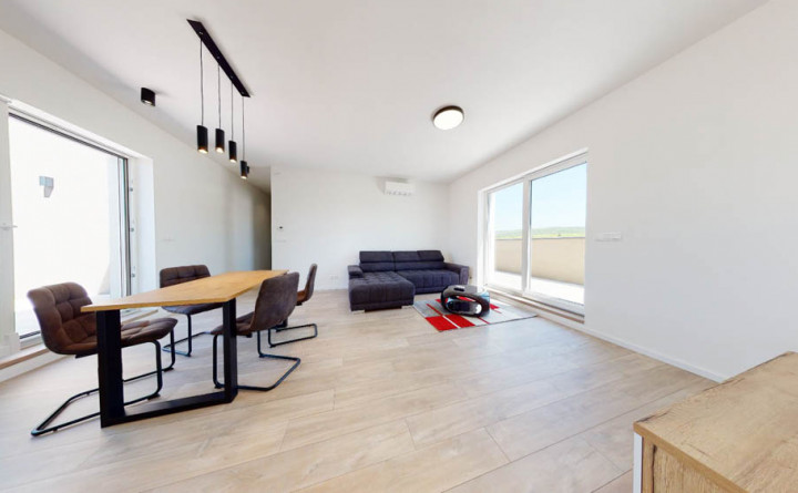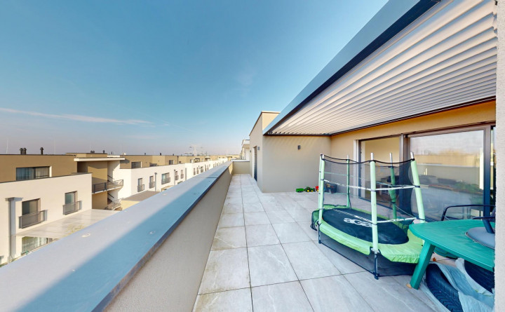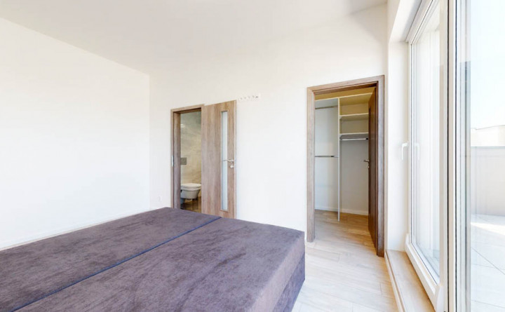 Dispozícia: zádverie, chodba, kúpeľňa s WC, priestranná obývačka čiastočne prepojená s kuchyňou, dve spálne. Hlavná spálňa disponuje samostatnou kúpeľňou s WC a šatníkom. Z každej miestnosti je prístupná priestranná terasa ktorá je orientovaná po oboch stranách bytu. Exteriérové žalúzie, klimatizácia, hliníková pergola.