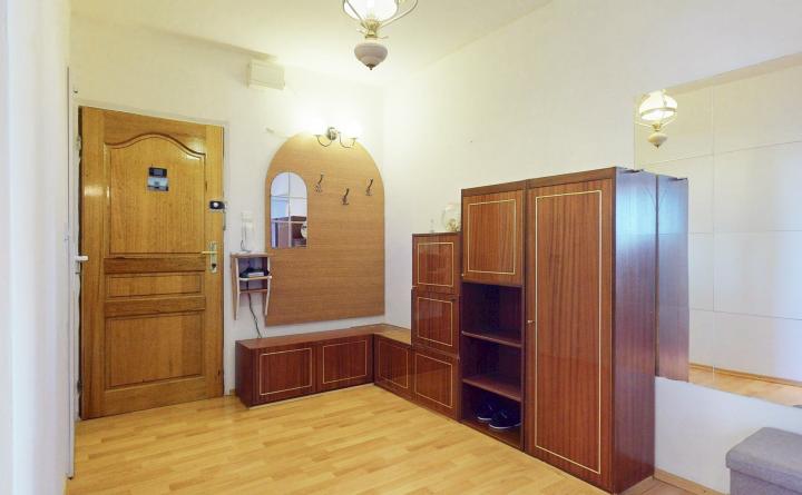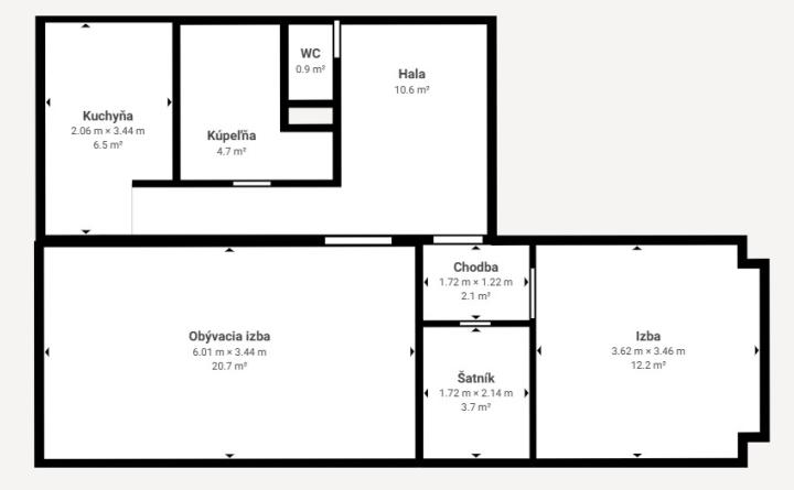 Vstupná hala, kúpeľňa s vaňou aj sprchovým kútom, samostatné WC, obývacia izba, kuchyňa, chodba, izba so šatníkom.