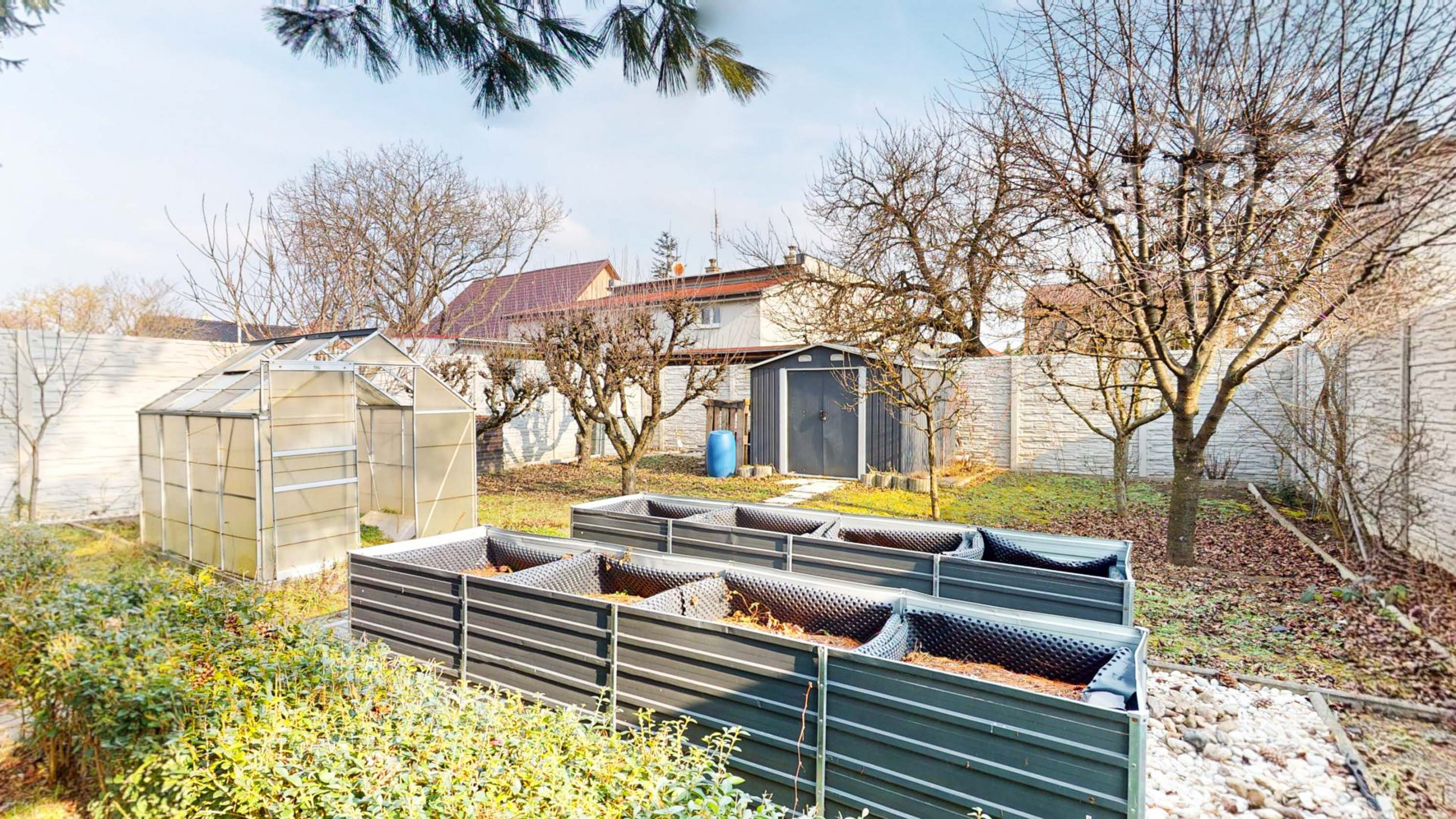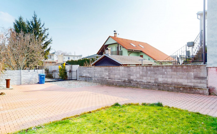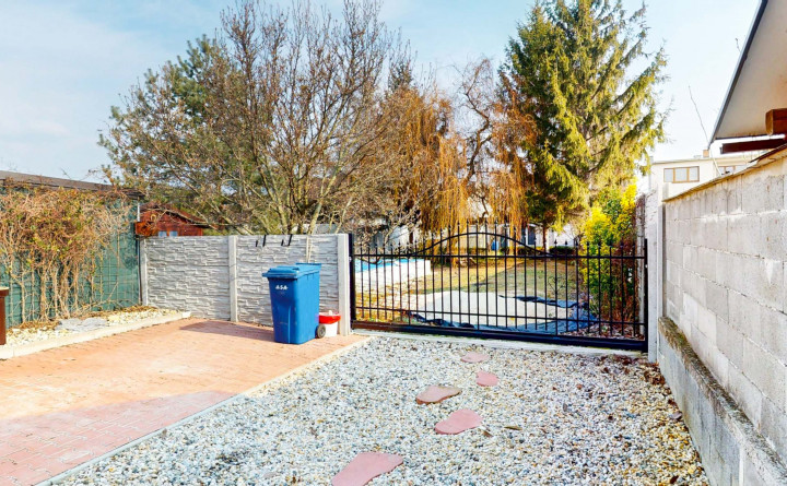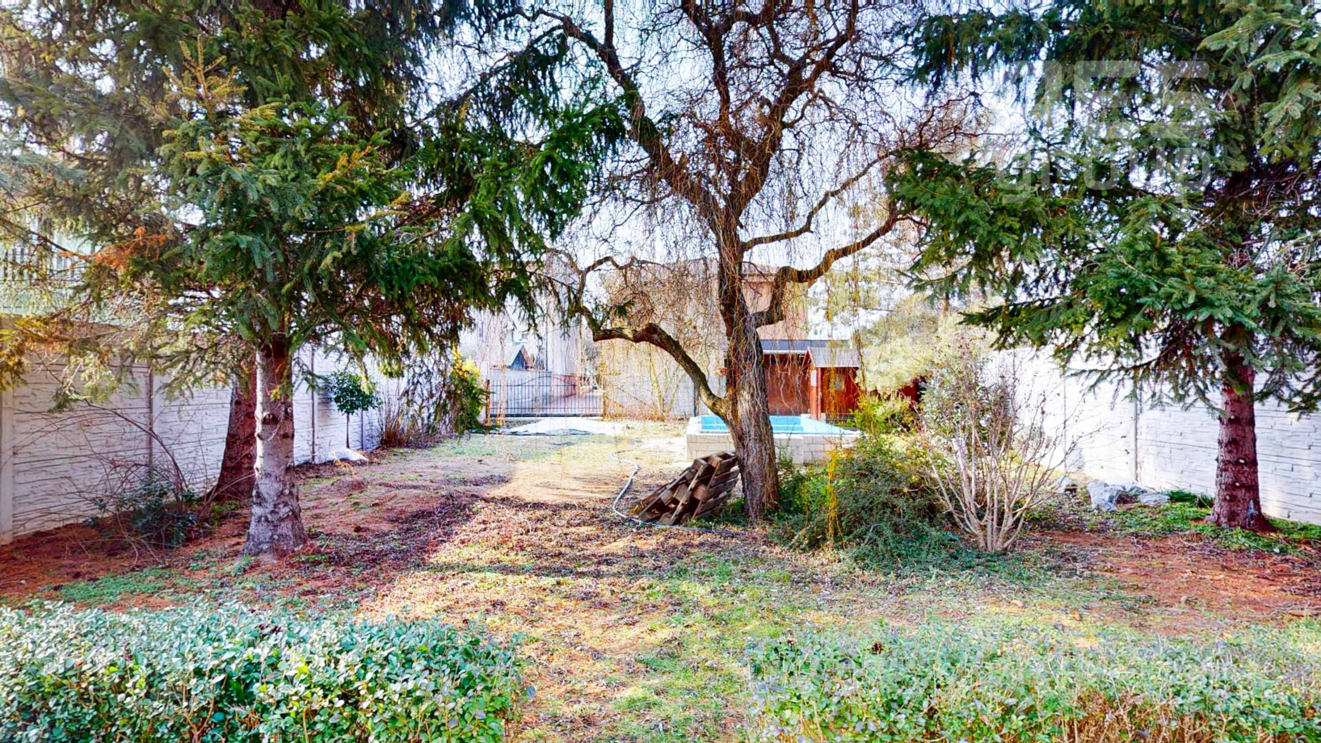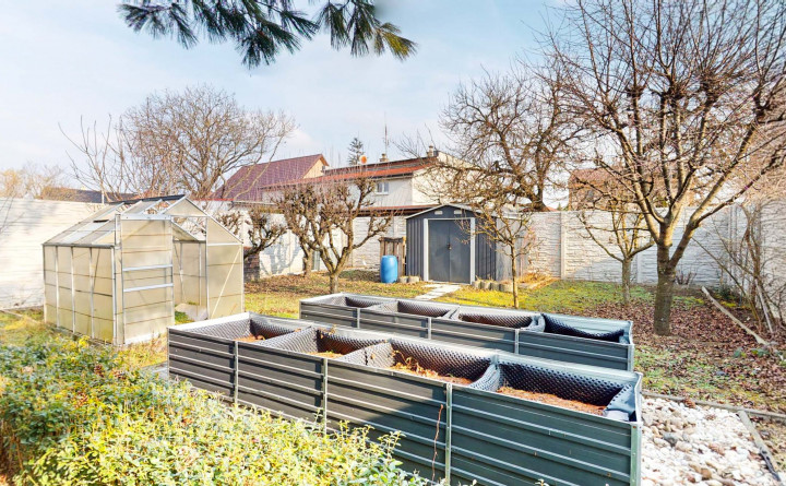 Záhrada je rozdelená na dve časti. Predná časť z prevažne zámkovej dlažby riešená ako nádvorie, obkolesené domom a dvojgarážou. Zadná časť slúžiaca na relax a oddych je riešená formou okrasnej záhrady s množstvom stromov, dvoma záhradnými domčekmi, skleníkom a bazénom .