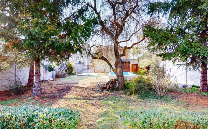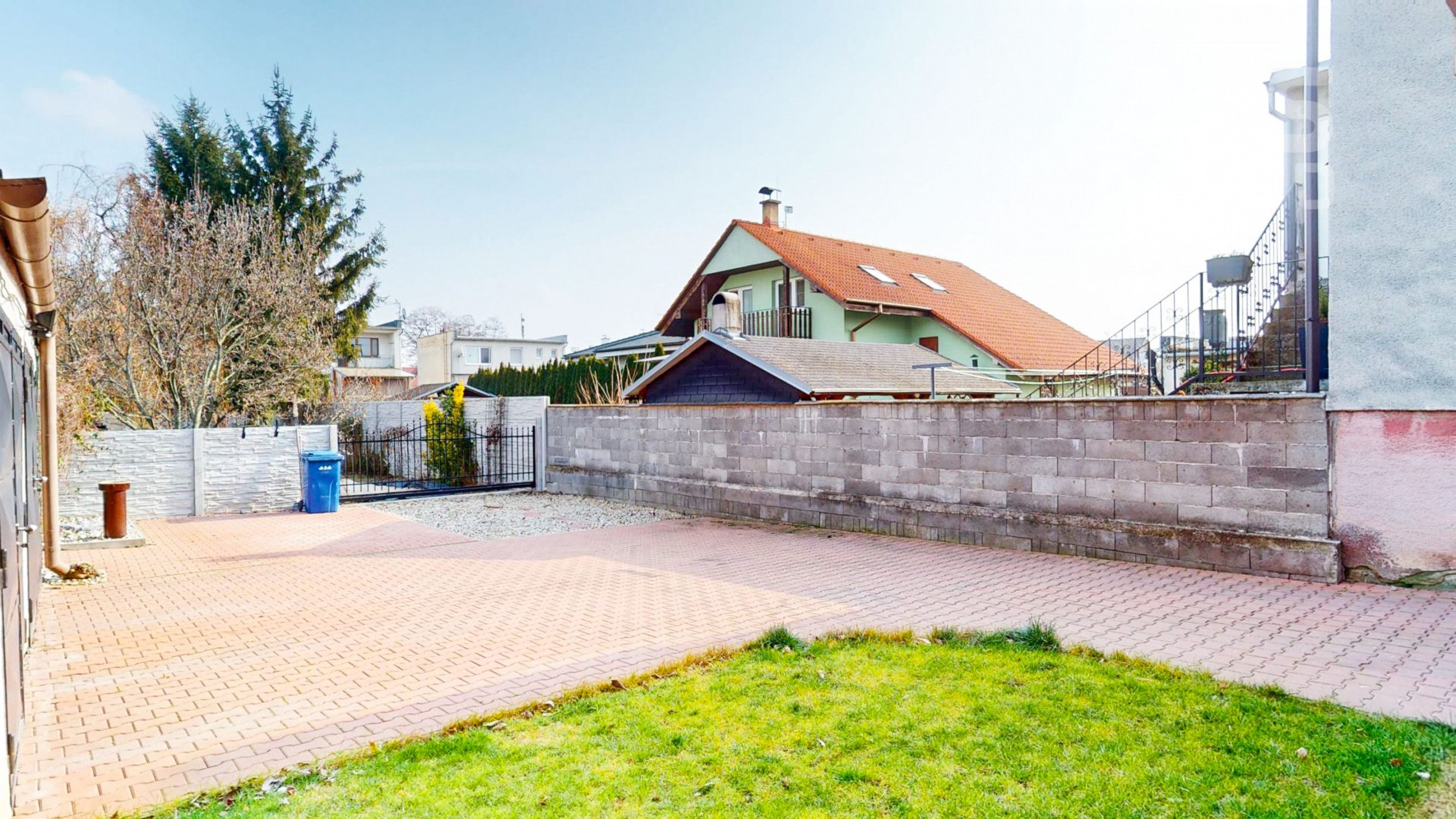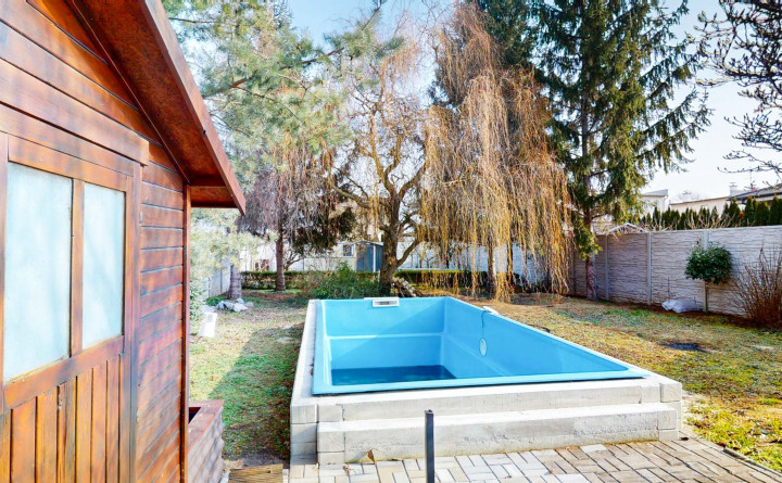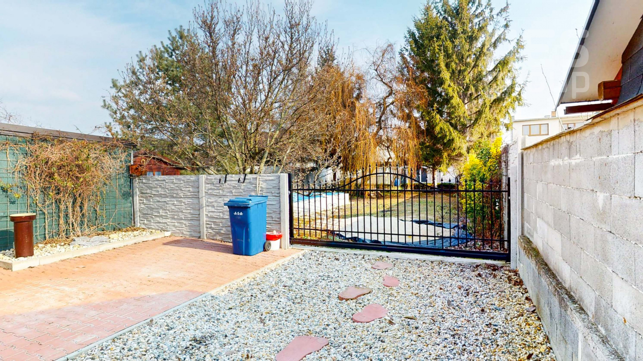 Záhrada je rozdelená na dve časti. Predná časť z prevažne zámkovej dlažby riešená ako nádvorie, obkolesené domom a dvojgarážou. Zadná časť slúžiaca na relax a oddych je riešená formou okrasnej záhrady s množstvom stromov, dvoma záhradnými domčekmi, skleníkom a bazénom .