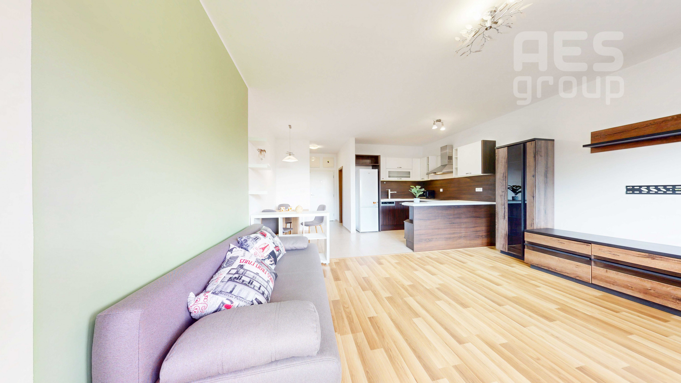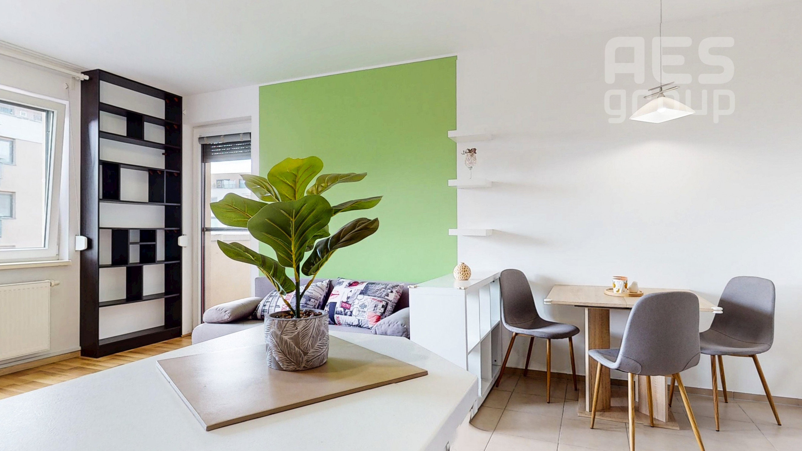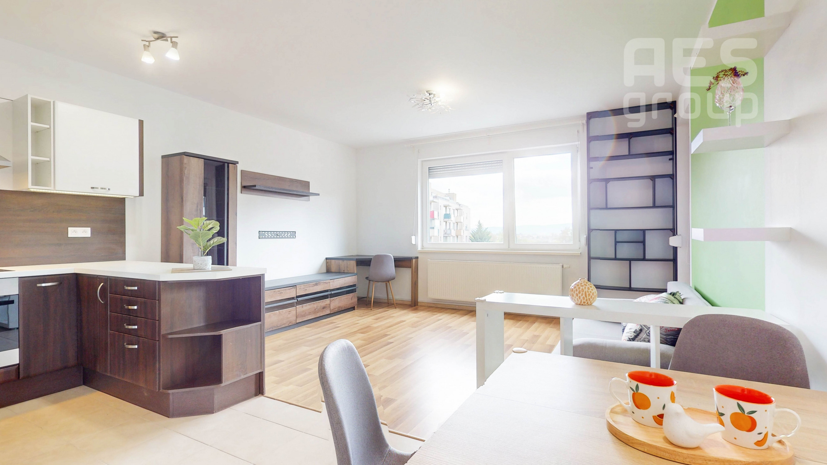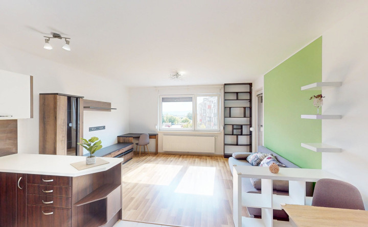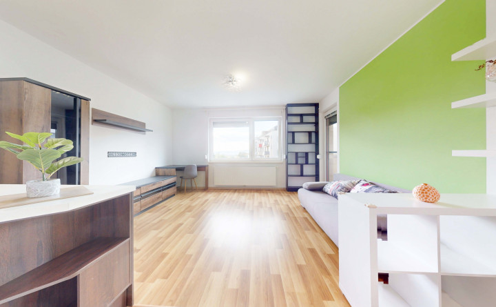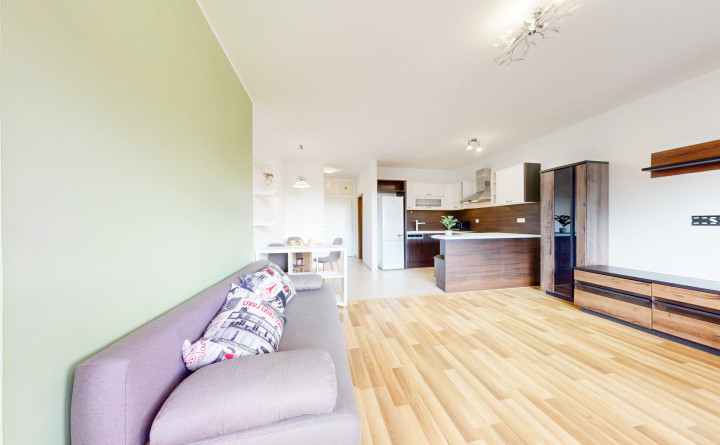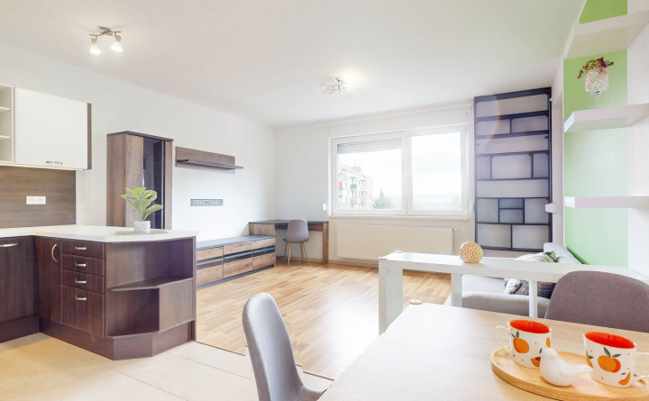 Dispozícia: vstupná chodba, priestranná obývačka spojená s kuchyňou a jedálenským kútikom, spálňa. Z chodby je prístupná kúpeľňa a samostatné WC. Zo spálne a obývačky je prístupný balkón s výmerou 5 m2.