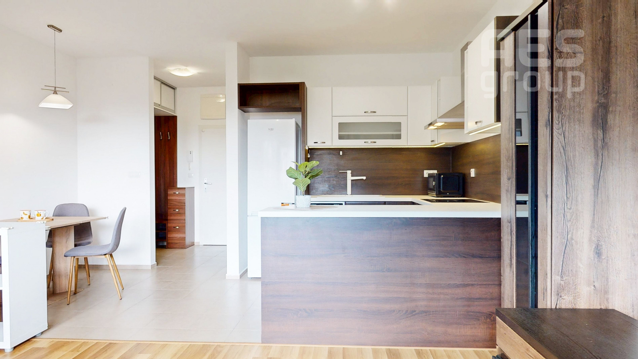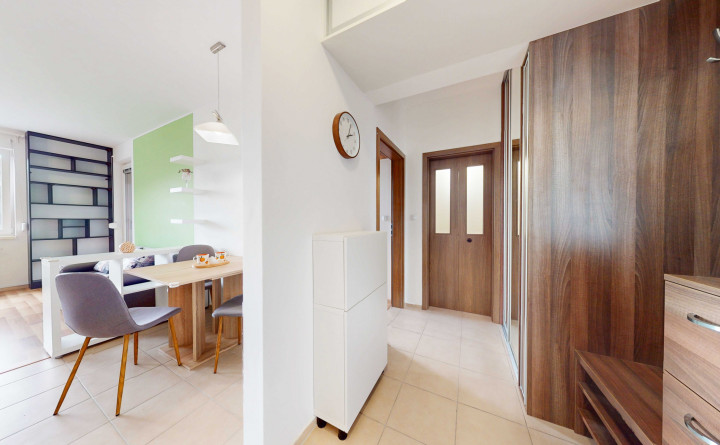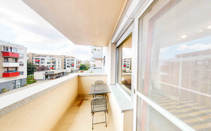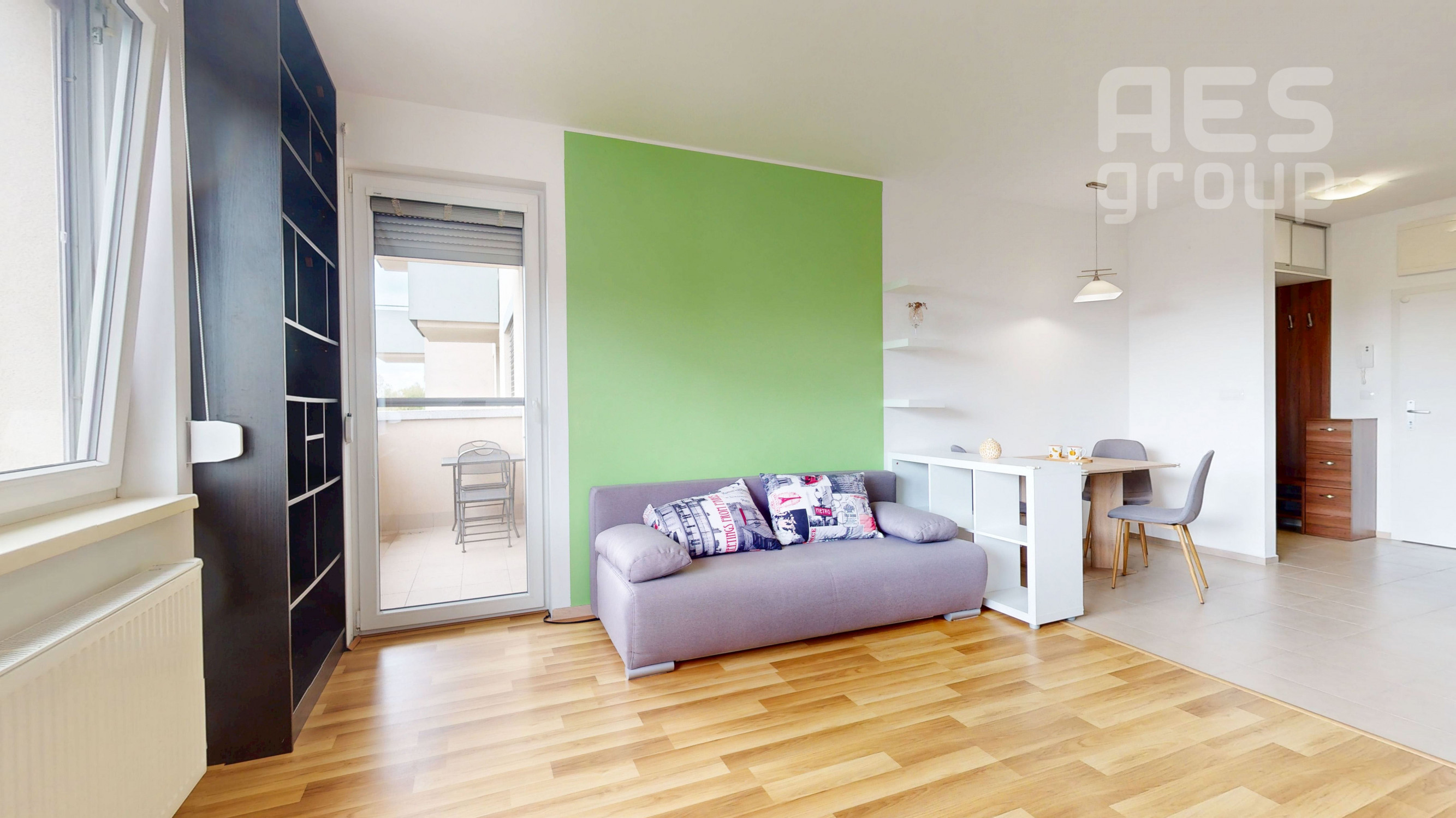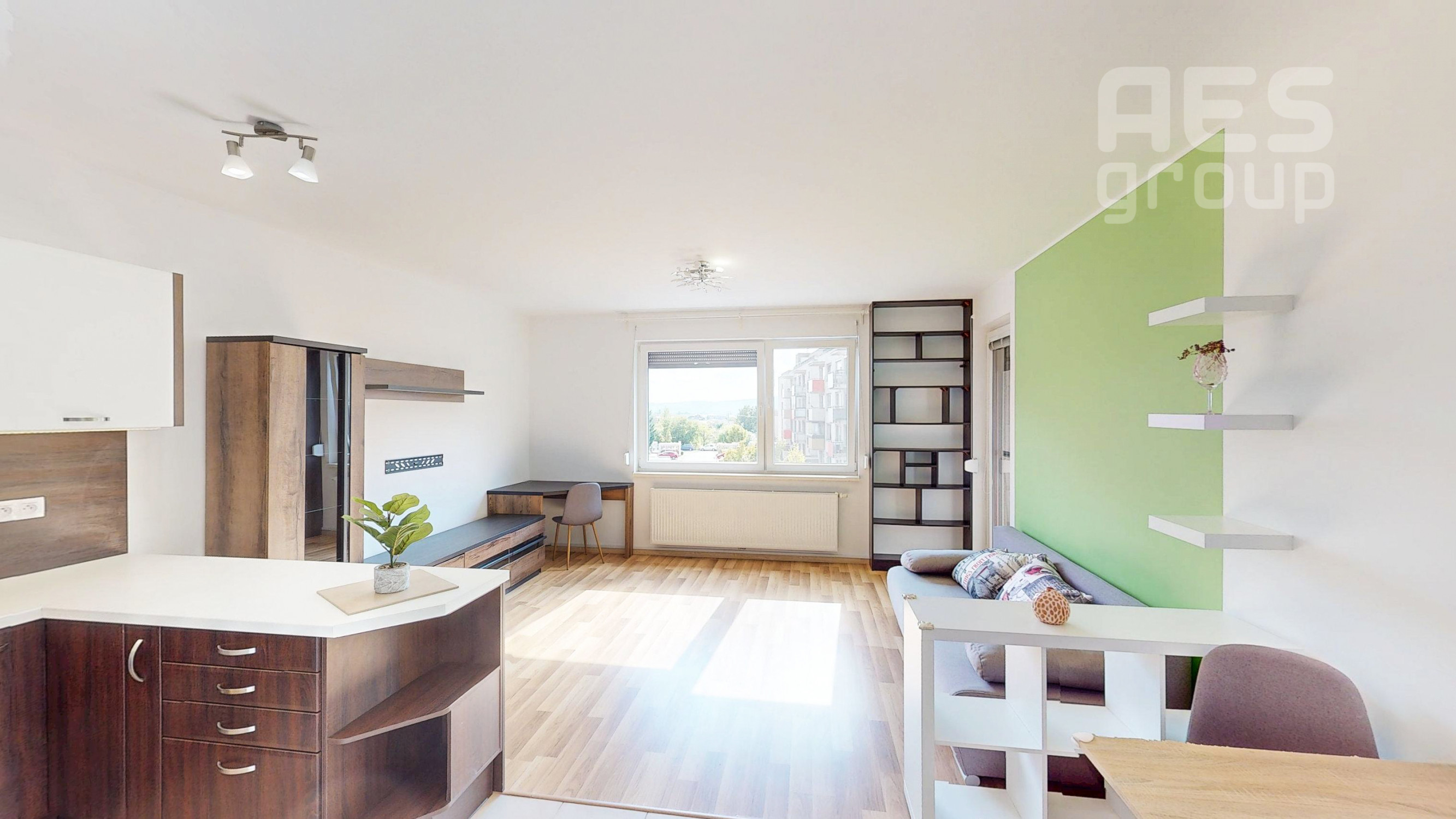 Dispozícia: vstupná chodba, priestranná obývačka spojená s kuchyňou a jedálenským kútikom, spálňa. Z chodby je prístupná kúpeľňa a samostatné WC. Zo spálne a obývačky je prístupný balkón s výmerou 5 m2.