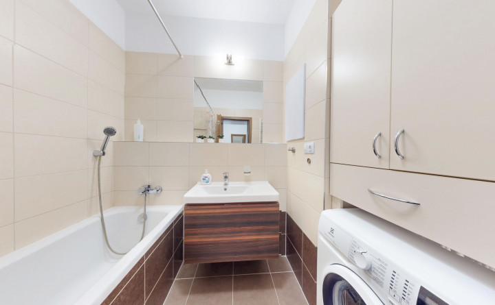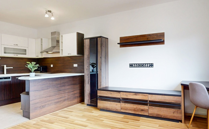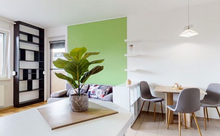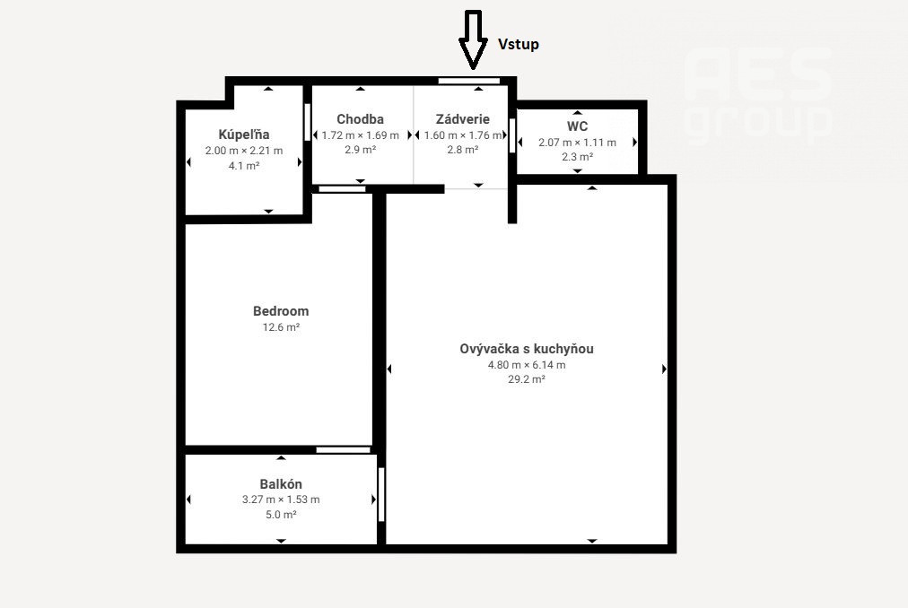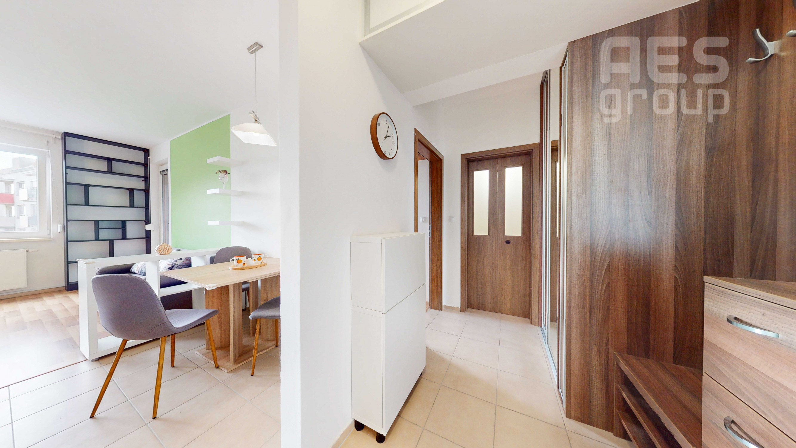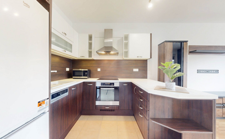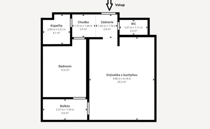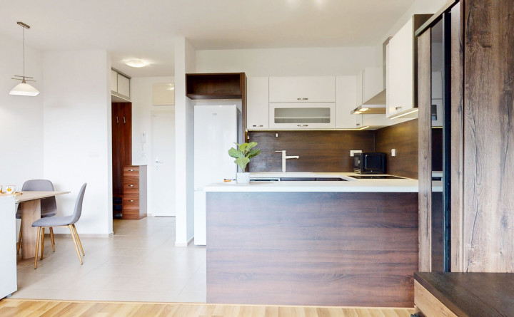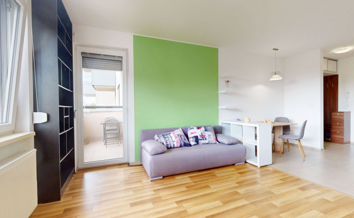 Dispozícia: vstupná chodba, priestranná obývačka spojená s kuchyňou a jedálenským kútikom, spálňa. Z chodby je prístupná kúpeľňa a samostatné WC. Zo spálne a obývačky je prístupný balkón s výmerou 5 m2.