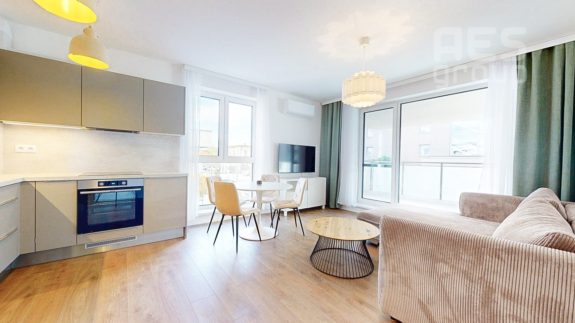 Vstupná chodba, samostatné WC, kúpeľňa s vaňou, spálňa, izba, priestranná obývačka s kuchyňou a jedálenským kútom. Z obývačky a spálne je prístupná terasa s južnou orientáciou.