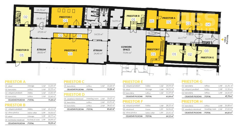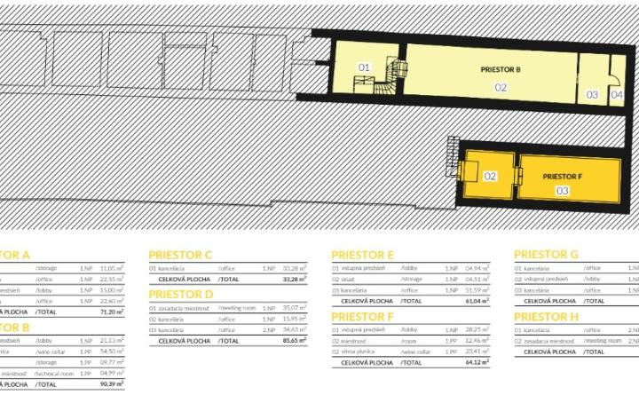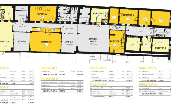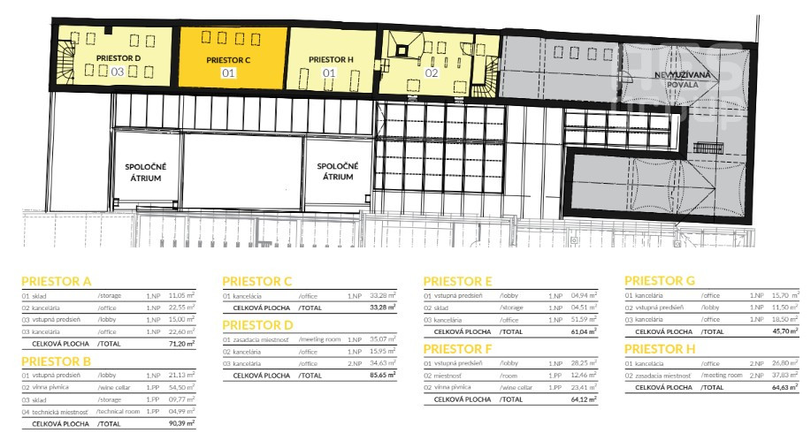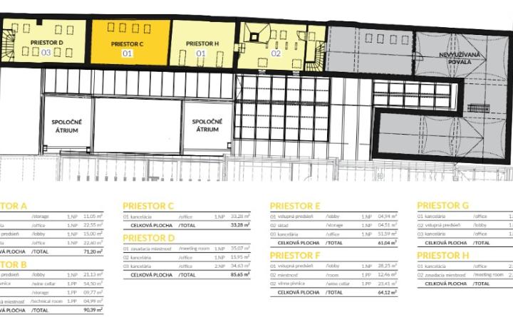 Súčasťou priestorov sú spoločné átriá s možnosťou využitia na rôzne spoločenské udalosti ako výstavy, vernisáže, ochutnávky vín a pod. Na spoločnej chodbe sa nachádzajú toalety rozdelené na dámsku a pánsku časť.