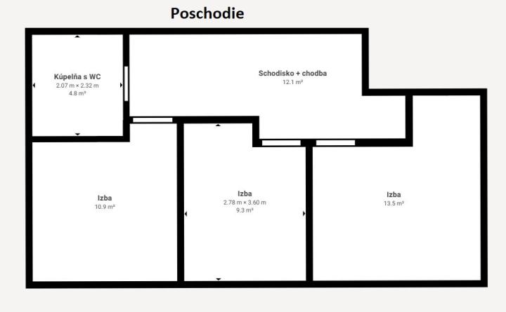 2 NP: chodba, schodisko, 3 priestranné spálne, kúpeľňa spojená s toaletou, technická miestnosť.