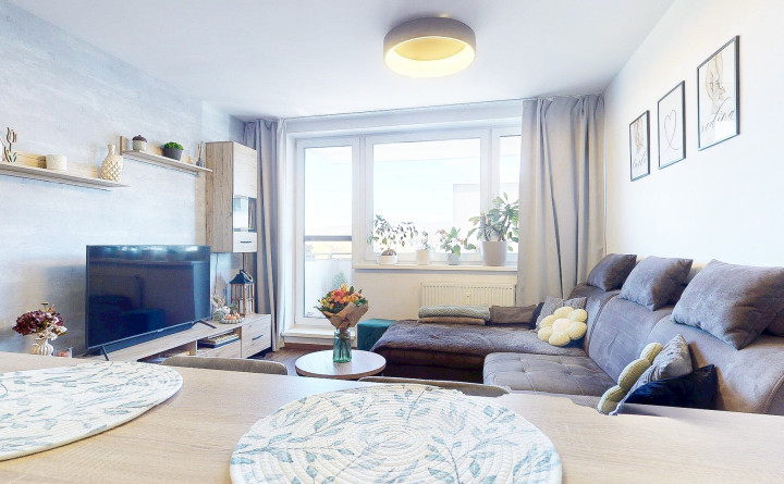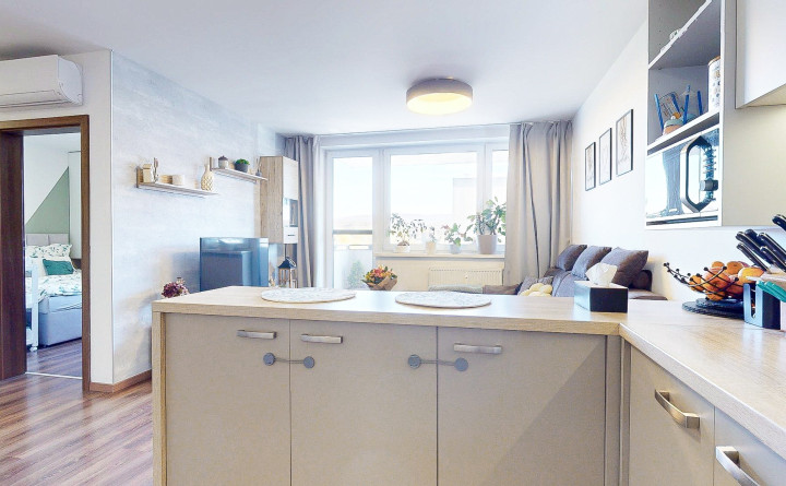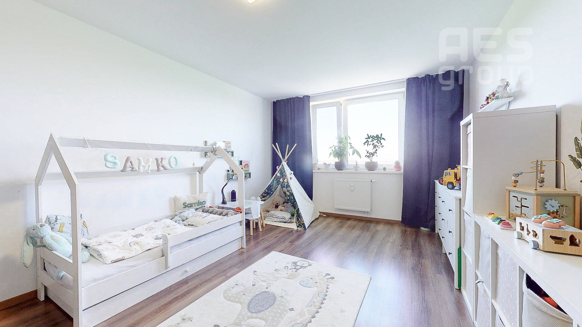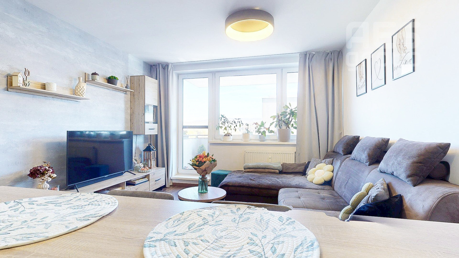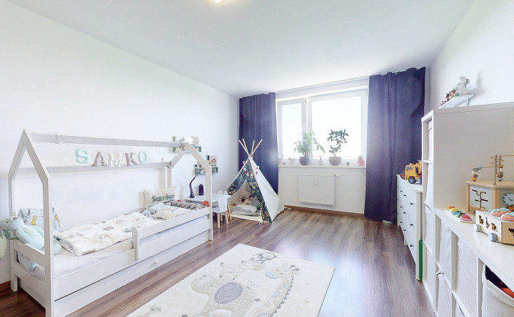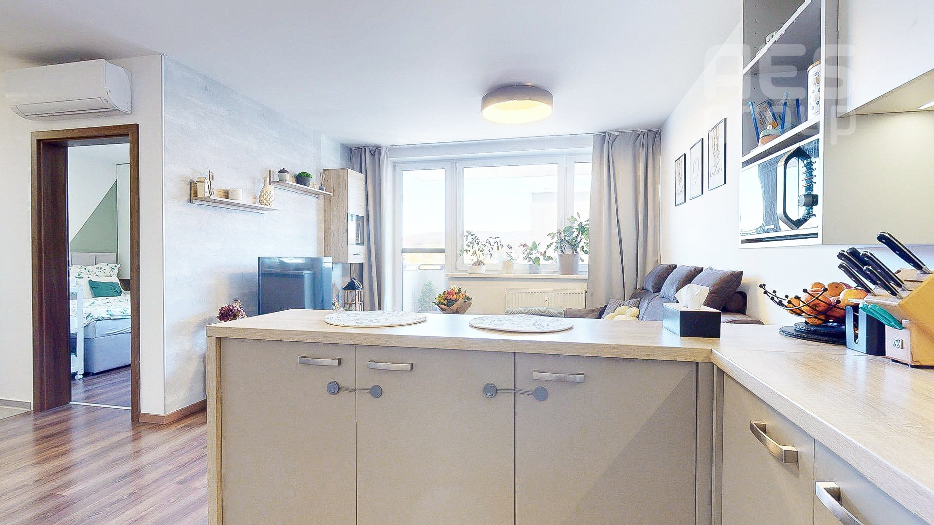Dispozícia bytu je rozdelená na: zádverie, obývacia izba funkčne prepojená s kuchyňou, spálňa, detská izba, chodba, kúpeľňa s vaňou a samostatné WC. Z obývacej izby je prístupný balkón so západnou orientáciou o výmere 6,1 m2. K bytu prislúcha pivničná kobka na vrchom podlaží bytového domu a vonkajšie parkovacie státie. O komfort bývania najmä v letných mesiacoch sa postará klimatizácia umiestnená na chodbe.
