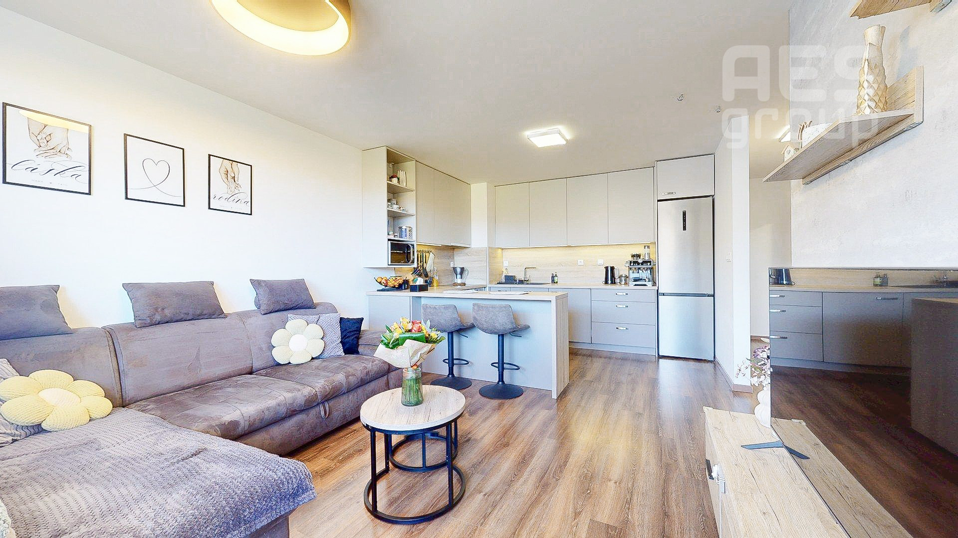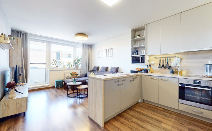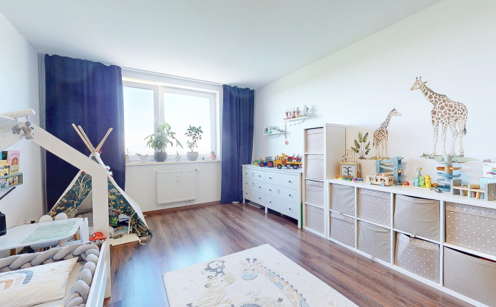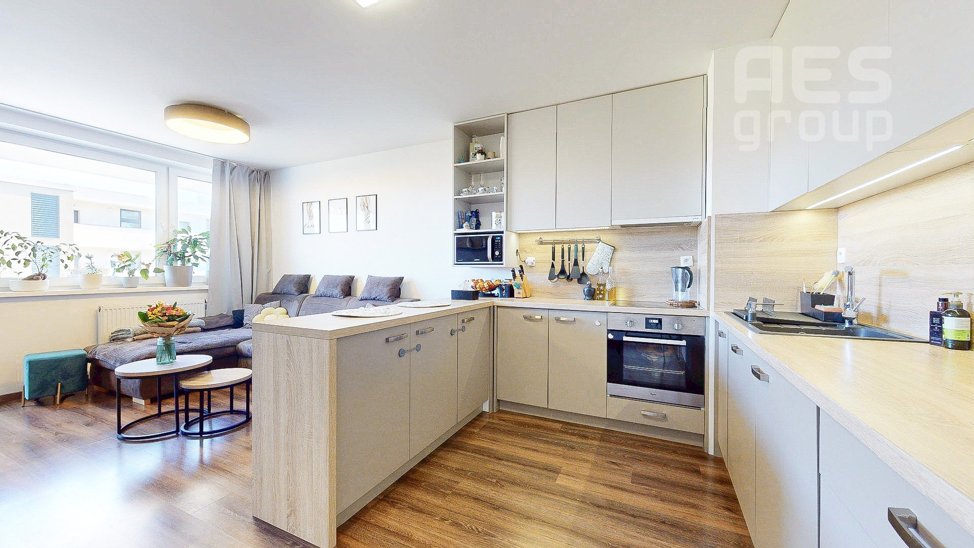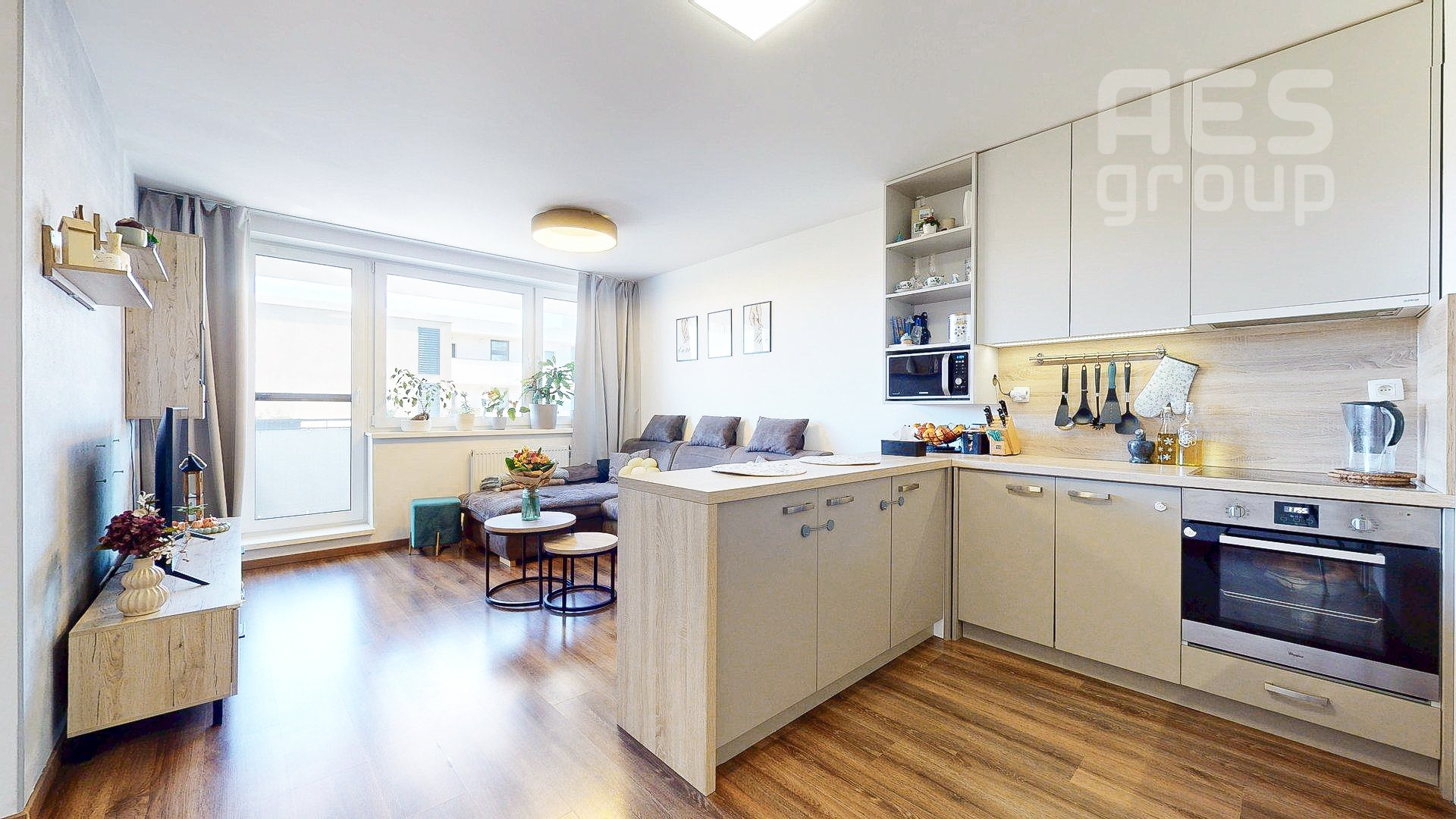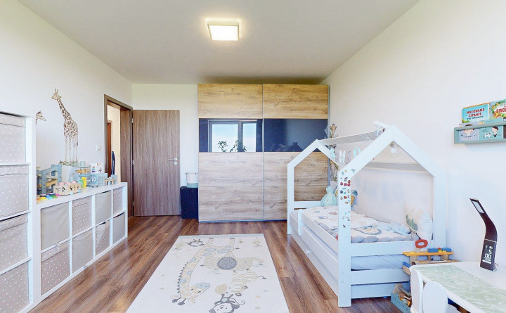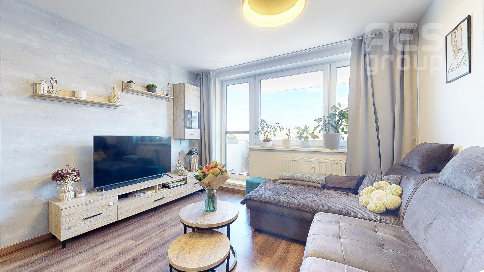 Dispozícia bytu je rozdelená na: zádverie, obývacia izba funkčne prepojená s kuchyňou, spálňa, detská izba, chodba, kúpeľňa s vaňou a samostatné WC. Z obývacej izby je prístupný balkón so západnou orientáciou o výmere 6,1 m2. K bytu prislúcha pivničná kobka na vrchom podlaží bytového domu a vonkajšie parkovacie státie. O komfort bývania najmä v letných mesiacoch sa postará klimatizácia umiestnená na chodbe.