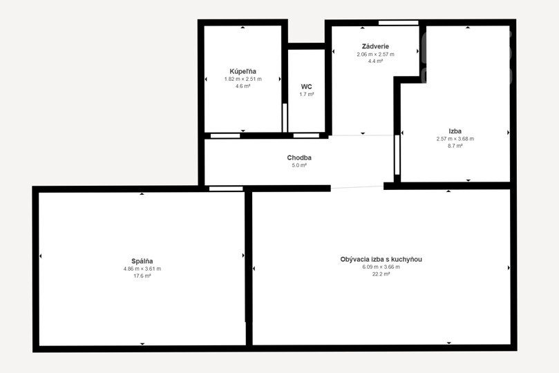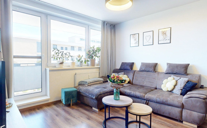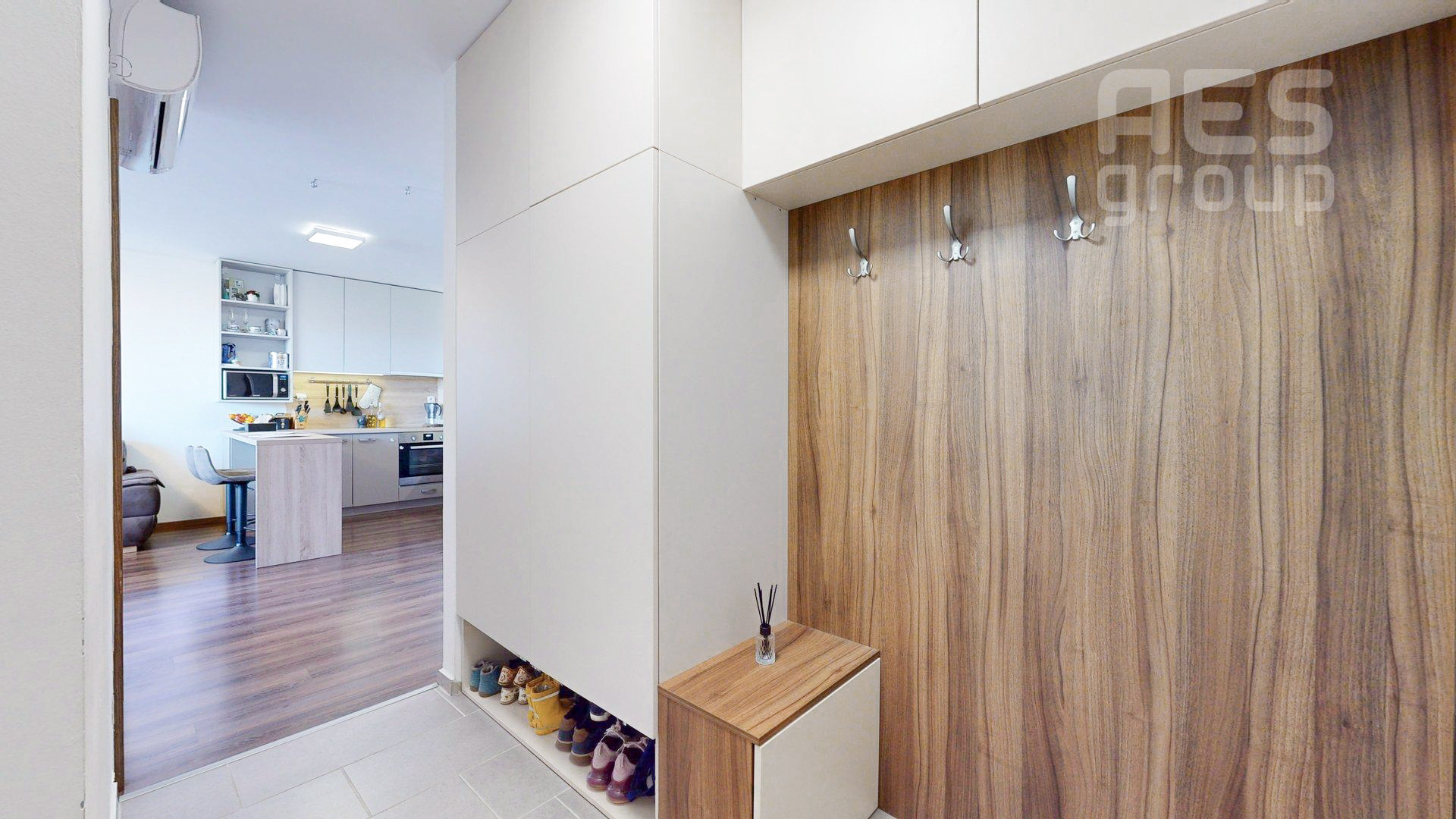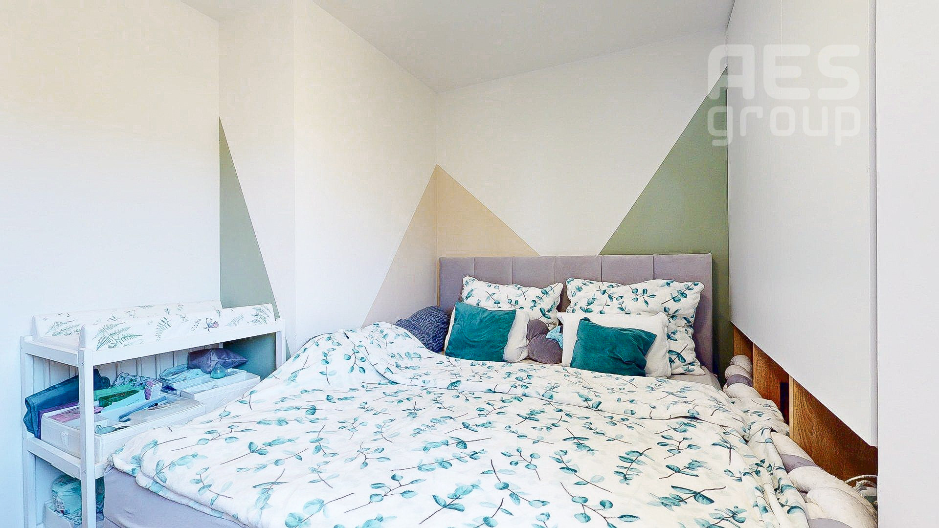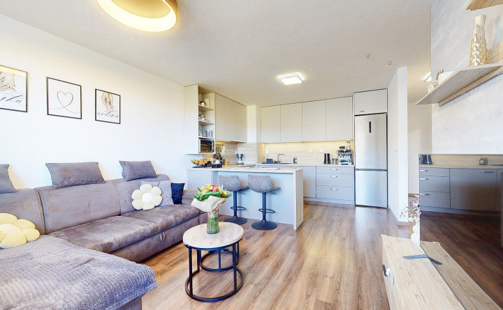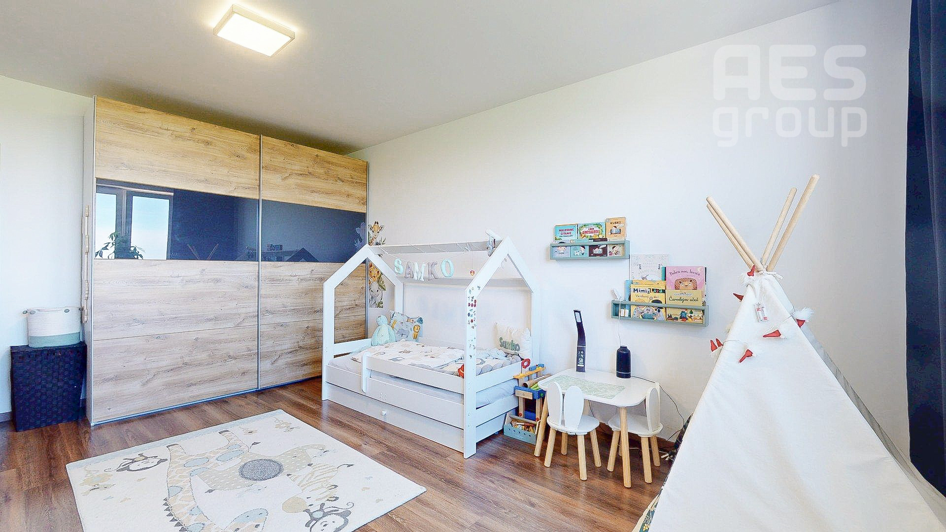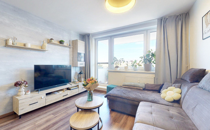 Dispozícia bytu je rozdelená na: zádverie, obývacia izba funkčne prepojená s kuchyňou, spálňa, detská izba, chodba, kúpeľňa s vaňou a samostatné WC. Z obývacej izby je prístupný balkón so západnou orientáciou o výmere 6,1 m2. K bytu prislúcha pivničná kobka na vrchom podlaží bytového domu a vonkajšie parkovacie státie. O komfort bývania najmä v letných mesiacoch sa postará klimatizácia umiestnená na chodbe.