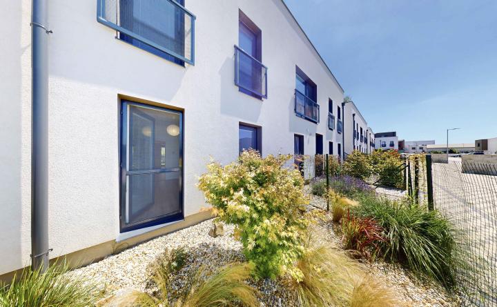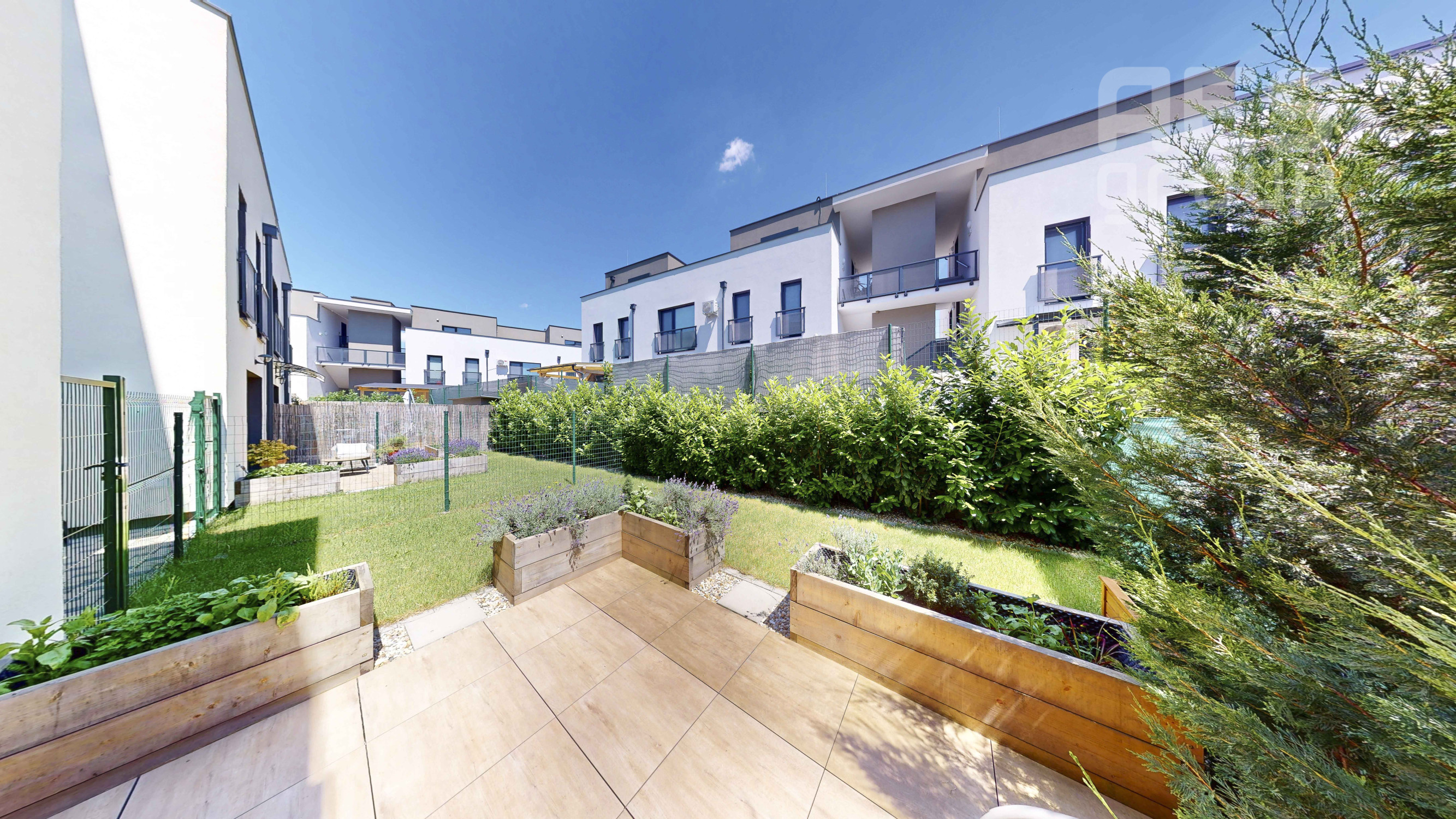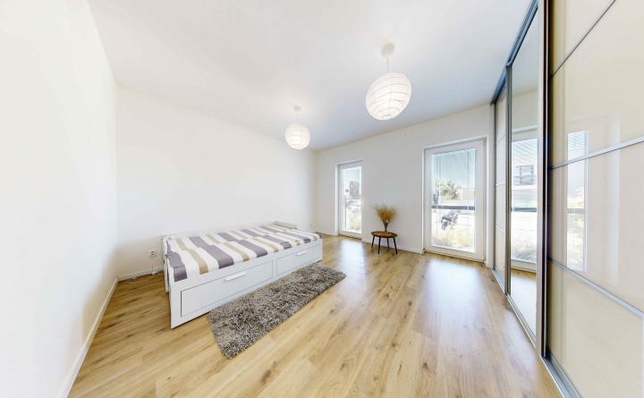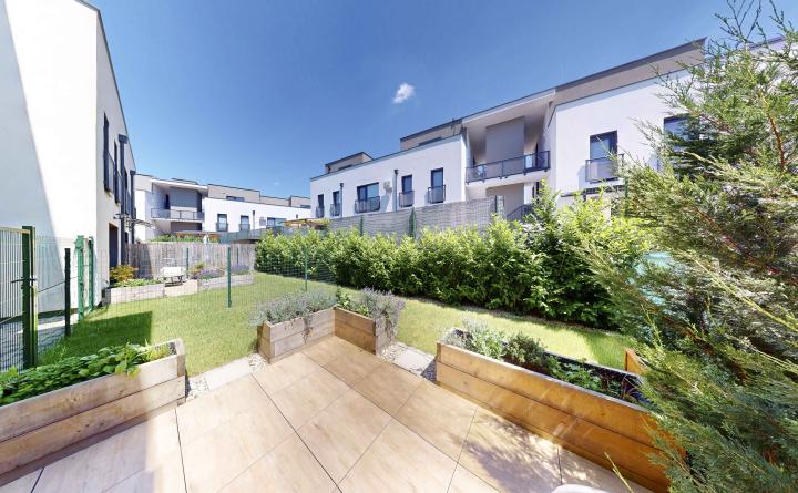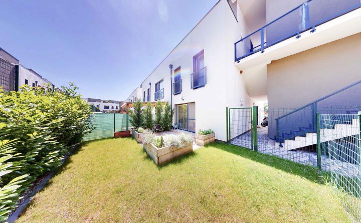 Dispozícia: zádverie, priestranná obývačka spojená s kuchyňou a jedálenským kútom, spálňa. Z chodby je prístupná kúpeľná spojená s WC. Byt disponuje dvomi predzáhradkami. Jenou menšou prístupnou zo spálne bytu o výmere 17 m2 a jednou väčšou prístupnej z obývačky o výmere 54 m2.