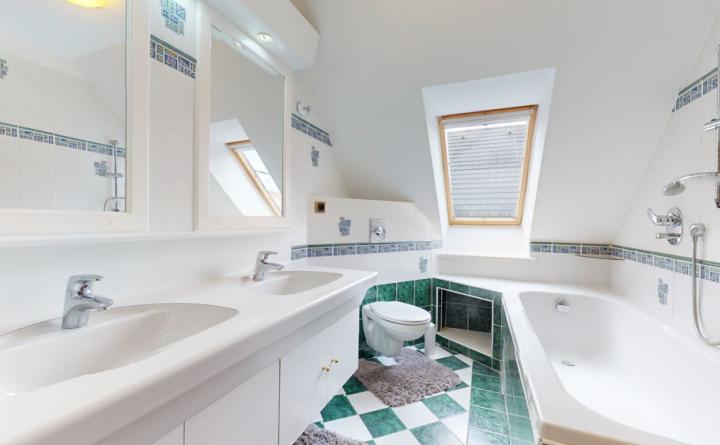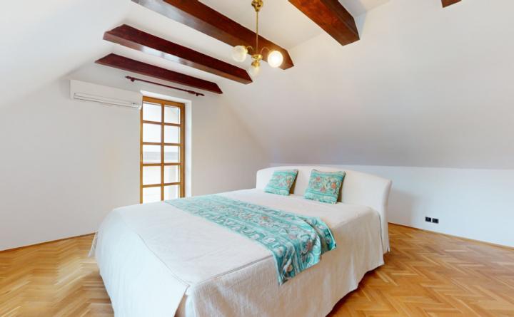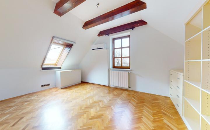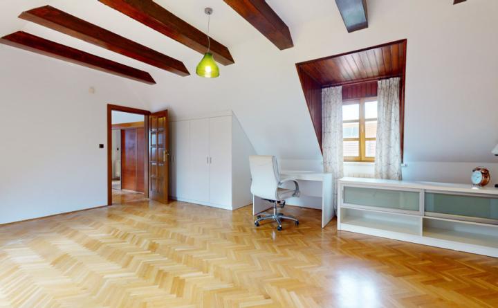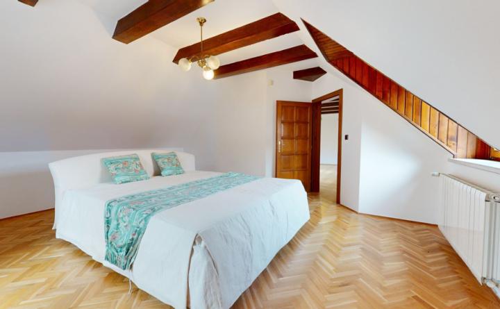 Poschodie: chodba, kúpeľňa s WC, izba, veľká priechodná izba so šatníkom a spálňa s prístupom na balkón