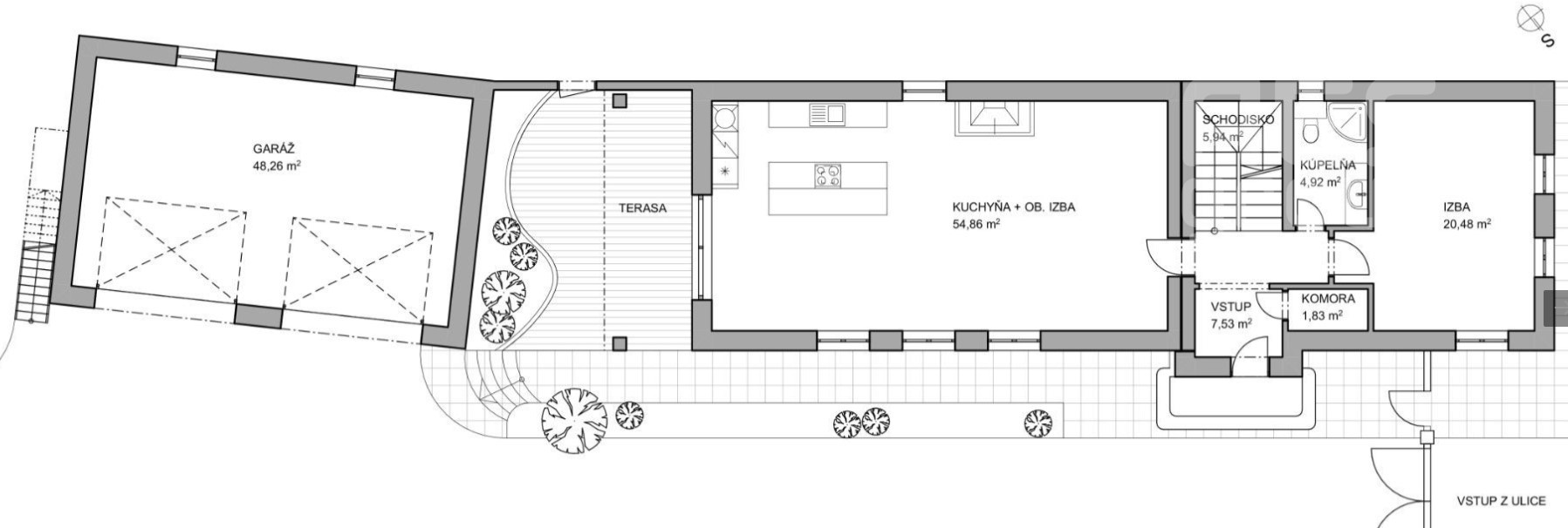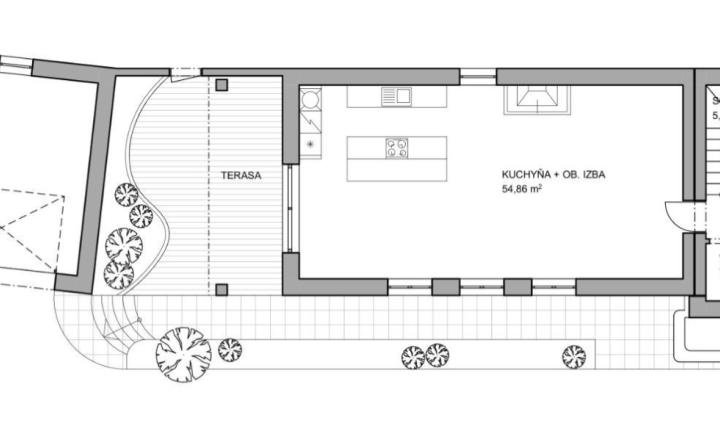 Prízemie: zádverie, technická miestnosť, veľká obývačka s krbom prepojená s veľkou kuchyňou a prístupom na terasu, kúpeľňa s WC, izba a schodisko