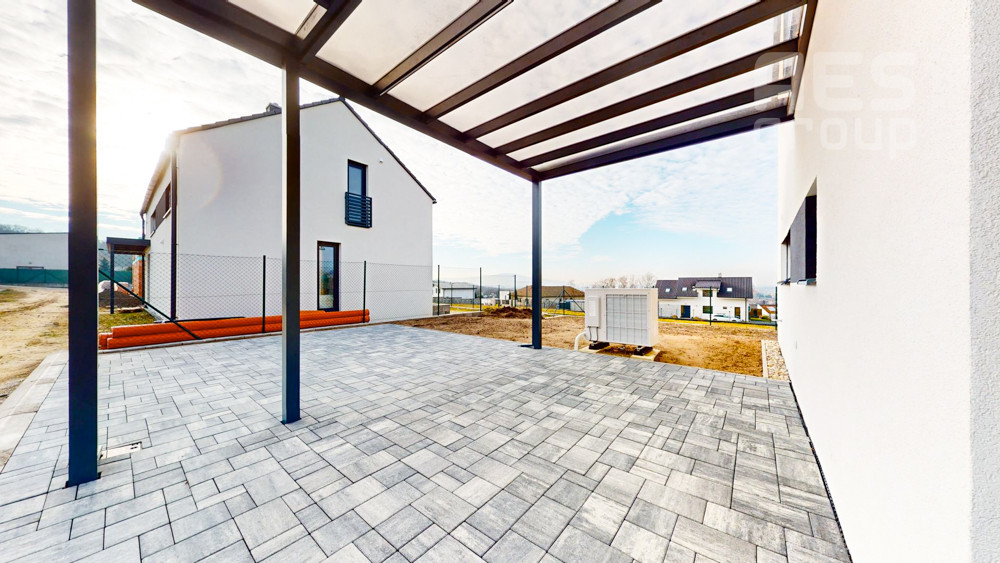 Parkovanie pre tri autá priamo na pozemku riešené formou spevnenej plochy, z toho parkovanie pre jedno auto pod prestrešenou hliníkovou pergolou.