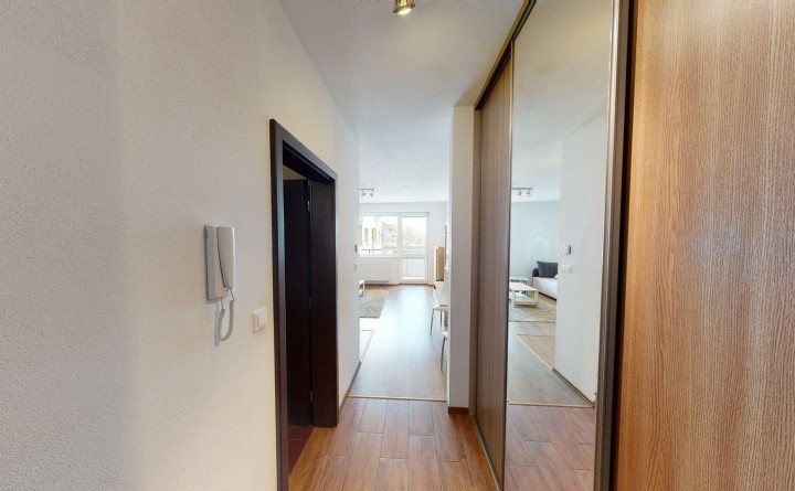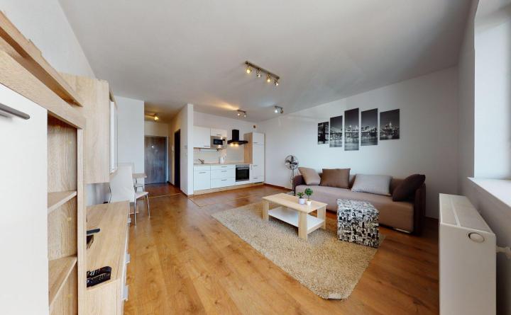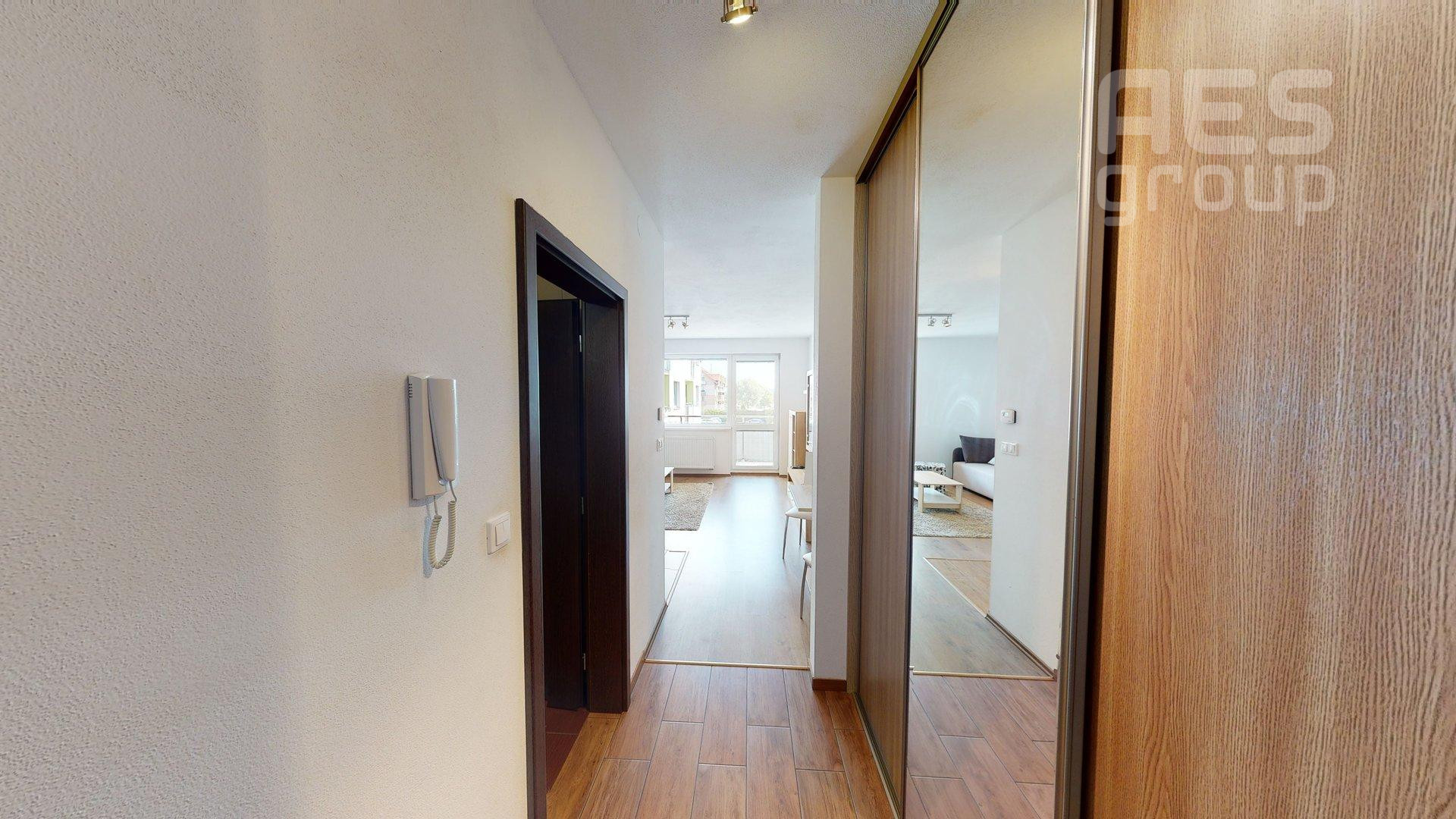 Byt pozostáva z predsiene, kúpeľne so sprchovacím kútom a WC a izby s kuchynským kútom. Južne orientovaný balkón s výmerou 3,50 m2 je prístupný z izby. K bytu patrí vnútorné parkovacie státie v garáži.
