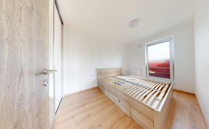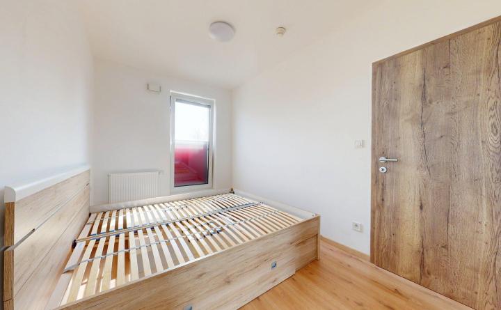Dispozícia je rozdelená na zádverie, obývačka je funkčne prepojená s kuchyňou a jedálenským kútom, spálňa, kúpeľňa so sprchovacím kútom, práčkou a samostatné WC.